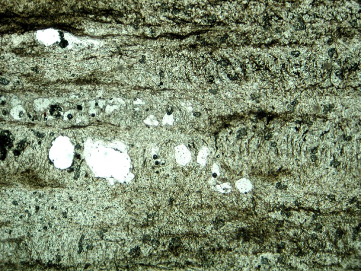 - 15,000 year old palisade fabric (stacked layers of vertical filaments) preserving fossilized terracettes and containing trapped gas bubbles (photosynthetic gas release by the mats). Tahunaatara, New Zealand
