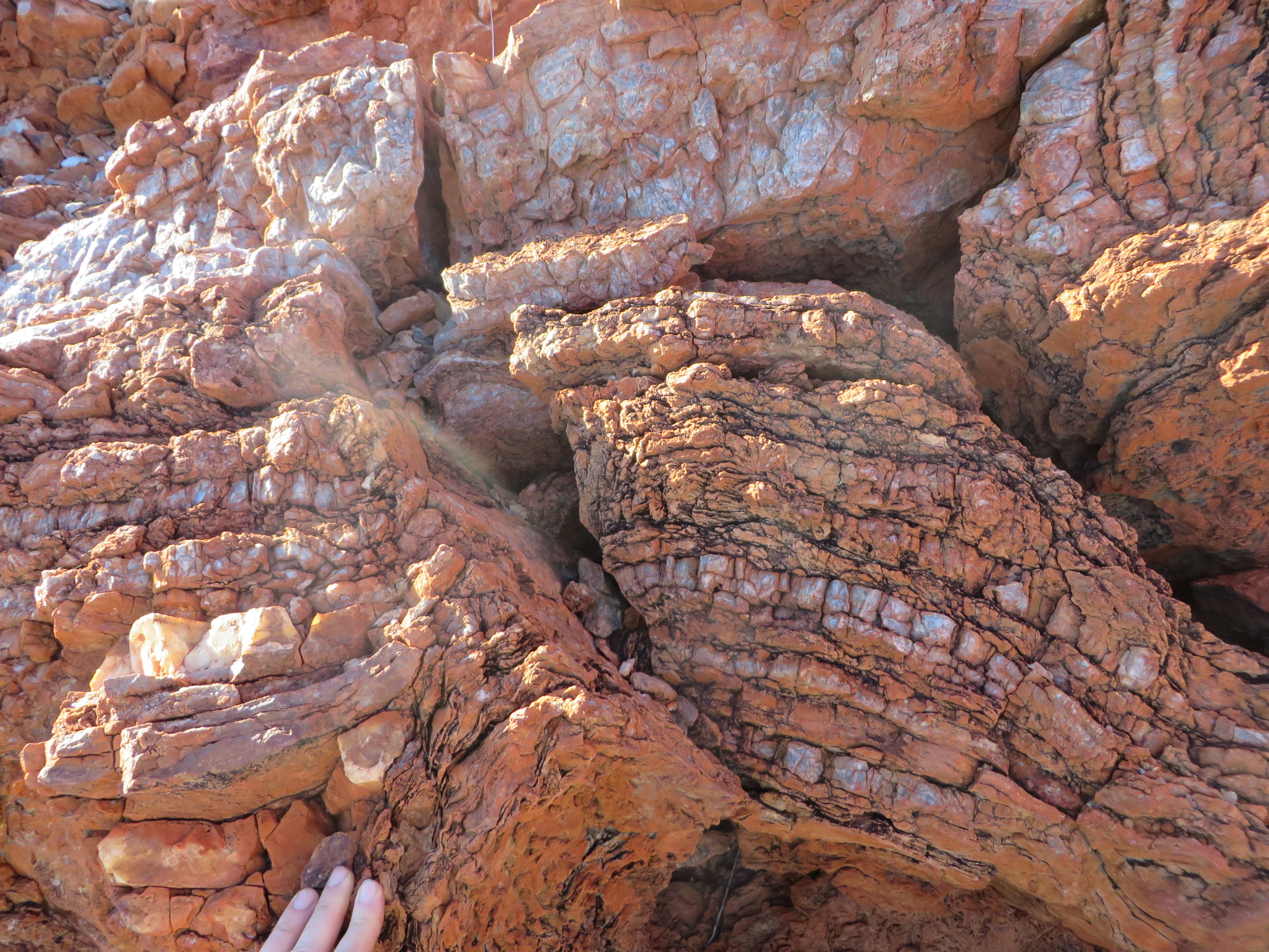 In the Dresser Formation rocks, there are wavy, layered, aggrading horizons that appear very similar to terracette (mini-terrace) deposits forming on hot spring discharge aprons that are building up the solid sinter deposit. In modern hot springs, these distal, i.e. relatively cool (<40 degrees Celsius), terracettes are covered in dense, pillar-like horizons (or ‘palisades’) of microbial filaments (Calothrix cyanobacterium). As the silica deposits upon the terraced surface of the spring discharge channels and pools, the sinter terracettes grow upward and outward to form distinctive internal growth features replete with microbial palisade textures.