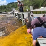 In February 2016, UNSW team members joined University of Auckland collaborators for a field trip to observe the formation mechanisms and role of microbes and mineralisation (in this case, silica discharging from the thermal waters) at varied active hot springs of the Rotorua area. For example, at Orakei Korako (or Hidden Valley) they encountered a large sheet of cyanobacteria (yellow) in gooey EPS, growing happily under a summer sun in moderately warm (~50 degrees Celsius) thermal waters, trapping zillions of bubbles of oxygen formed from photosynthetic microbial processes. Because the mats are constantly bathed in silica-rich thermal fluids, bubbles and microbes can become entombed in the siliceous hot spring deposits (sinter) to create a solid rock record of once ancient and, like in the Pilbara, long-gone geothermal activity.